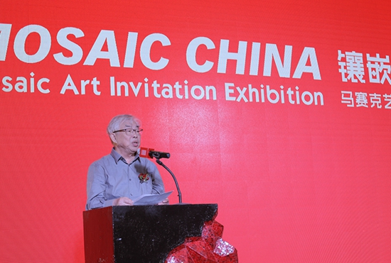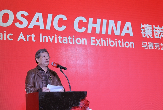 许钦松首先在展览开幕式上致辞。他代表中国美术家协会对展览开幕表示衷心的祝贺。他指出,中国壁画历史悠久,曾经创造了世界文化的高峰。上世纪70年代末,中国壁画复兴运动的创新精神曾经影响到了整个中国画坛。壁画作为一门公共艺术,与架上绘画不同,它需要在建筑与绘画之间寻求共生,而壁画材料与制作工艺的专题研究,恰恰是有效的连接桥梁。马赛克镶嵌工艺在壁画中的应用,具有很好的材料性能与艺术表现力。