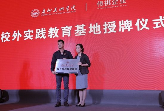 广州美术学院副院长林蓝教授向李伟达董事长颁授了“广州美术学院校外教学实践基地”牌匾。