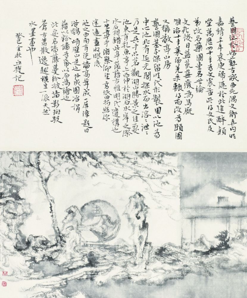 早在2005年,丘挺就开始研究各处园林,并以之入画。中国的园林,是人工与造化、人文与自然的综合载体。造园本就是一种艺术化的空间处理,丘挺以园林入画则是在此基础上的再次艺术化表达。贝聿铭在做建筑设计时为这个厅留下一面高通屋顶的窗,窗外是一片竹林,这次展览将打开这扇借景的窗,窗下是丘挺为此次展览创作的手卷《延月梳风》,拙政园的风景将随着手卷在窗外的竹影下渐次展开,令作品与场域之间形成一种对话。