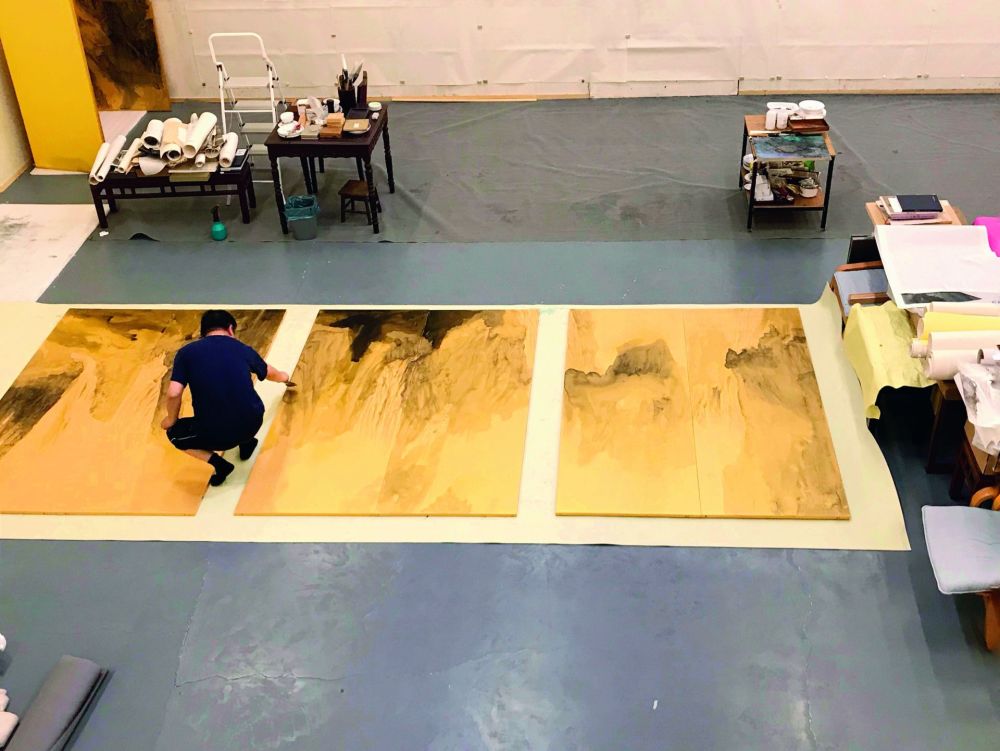 尤为引人关注的是,此次也展出了丘挺的大幅作品。在他的认识中,山水画追求的方向应该是绘画的纯度,而非叙事性。他期望营造的是一种恍兮惚兮、大道无垠的意境。考察丘挺近几年的大幅山水创作,往往不再拘泥于具体山形水势的描绘,而是通过水、墨关系的生发创造出意象化的山水图像。在此基础上,他还进行了纸本、绢本、金笺、独幅、组画、屏风等不同材料和形式的尝试,最大限度地在传统的根脉上拓展出新的山水境界。