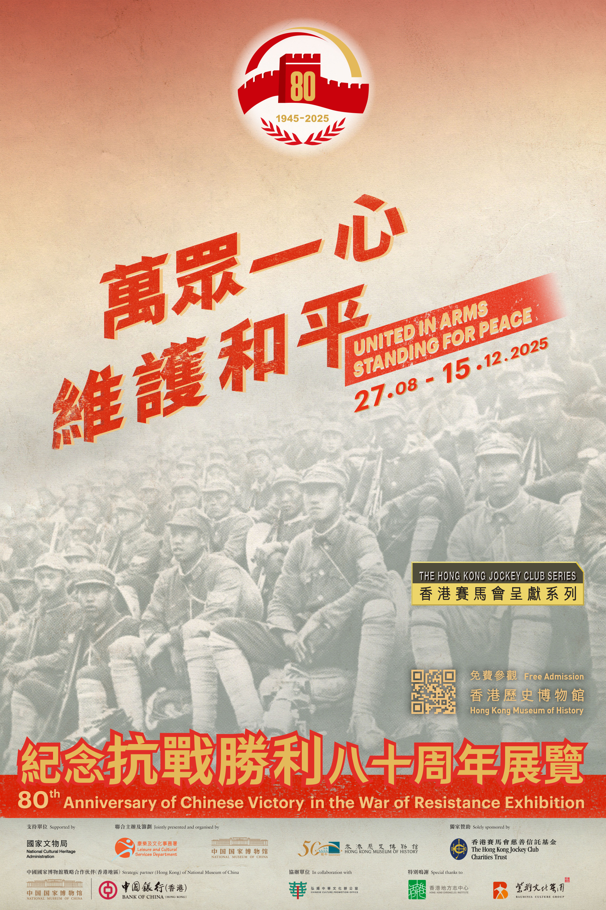 “万众一心 维护和平——纪念抗战胜利八十周年展览”由国家文物局指导,香港康乐及文化事务署、中国国家博物馆联合主办,香港历史博物馆、中国国家博物馆联合筹划,在中国国家博物馆战略合作伙伴中国银行的支持下,预计8月27日至12月15日在香港历史博物馆展出。展览共183件展品,其中82件由国家博物馆赴港展出,含8件一级文物。其余101件由香港历史博物馆及本地收藏家暨文博单位提供,约60件首次在香港展出。参展的82件国博馆藏已抵港,策展团队即将赴港开展布展工作。
