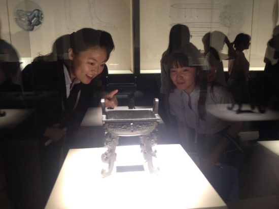 展厅中的“青铜化玉”部分,主要展示颐和园馆藏的青铜器及仿青铜玉器,观众可欣赏到商周至明清时期的青铜食器、酒器、乐器、水器、兵器及玉器等10余件历史文物,近距离感受古青铜器的艺术魅力。