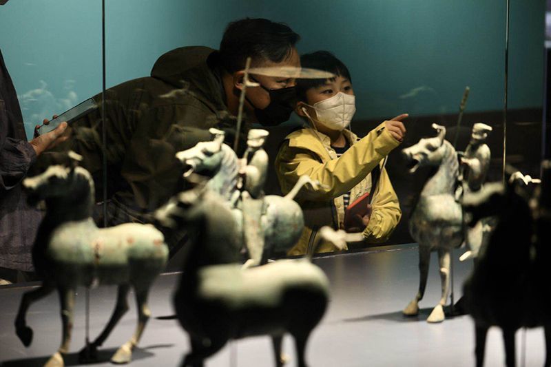 小朋友观看甘肃省武威市雷台墓出土的汉代铜骑士俑。
