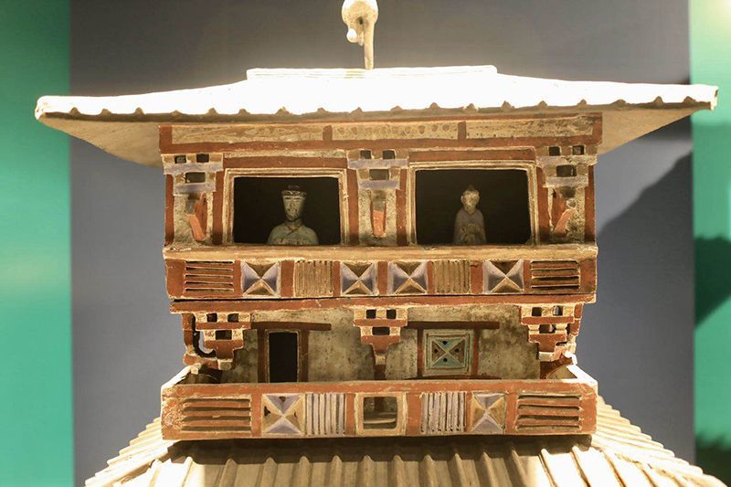汉代四层通体彩绘陶仓楼。