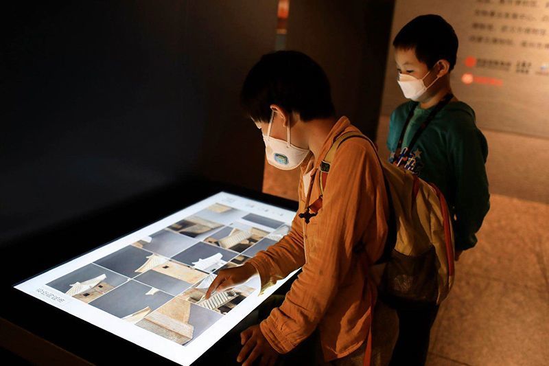 小观众体验文物拼图游戏。