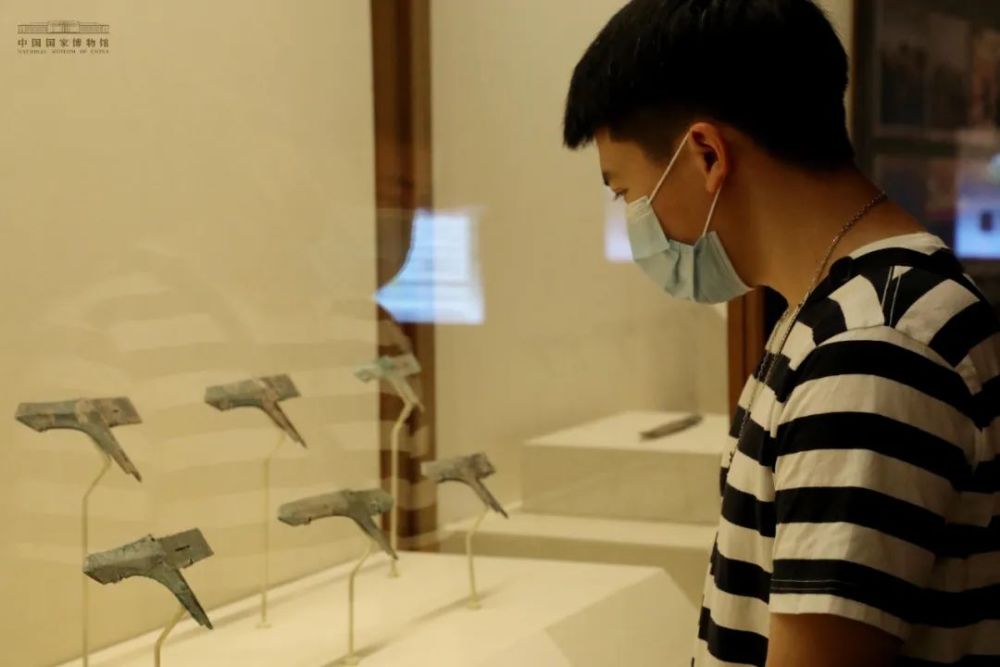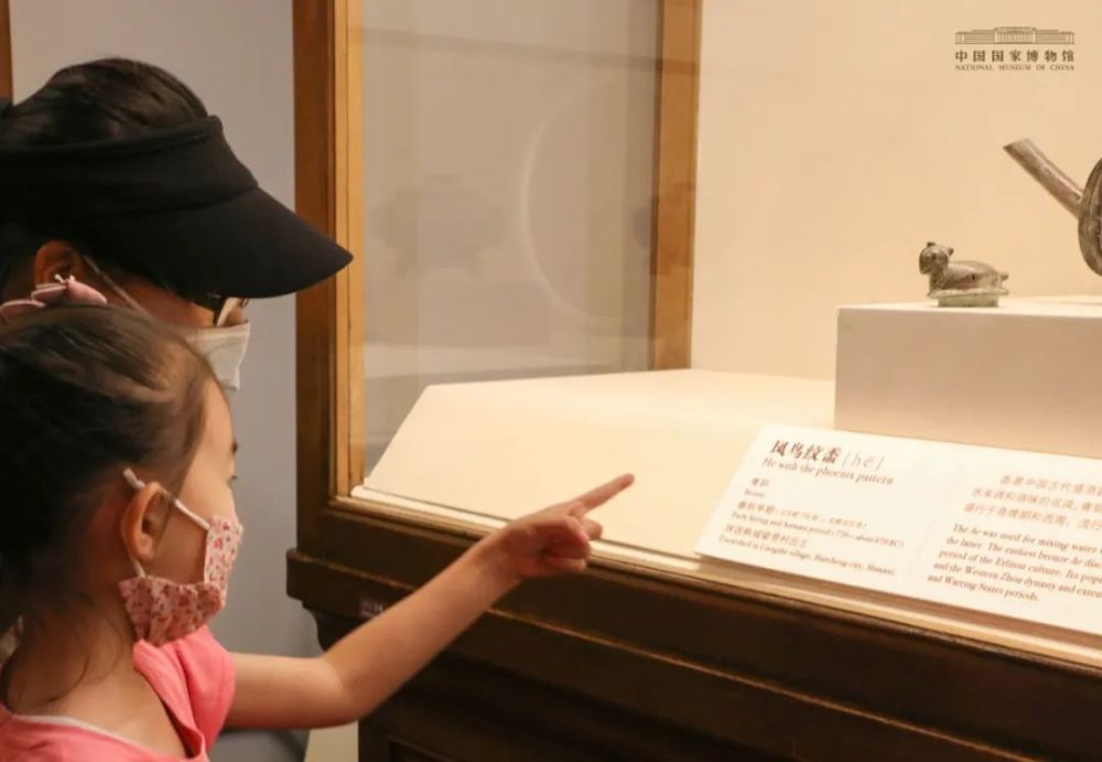 一位小朋友和妈妈一起参观正在国博展出的“周风遗韵——陕西刘家洼考古成果展”,注有拼音的展牌,让小朋友准确读出了青铜器的名字——“凤鸟纹盉”。
