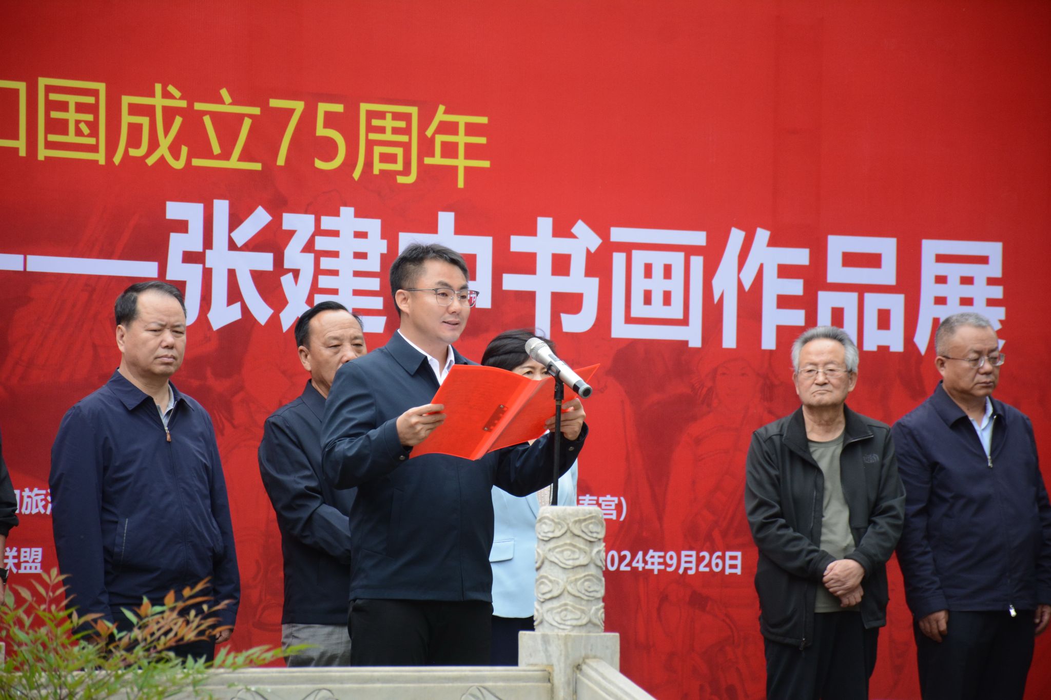 开幕仪式由天水美术馆馆长李靖主持,天水市人民政府副市长张兴军讲话,现场还进行了书画作品捐赠,张建中先生向天水美术馆捐赠了丈二书法作品毛泽东《沁园春·雪》及两幅麦积山石窟写生作品。天水市人大常委会副主任沈建玲、天水市政协副主席吴立新、原天水市政协副主席、天水市老年书画研究会会长王钦锡,天水市委宣传部副部长王刚,天水市文化和旅游局副局长李星杰,天水市文联副主席文军,甘肃省美协副主席、天水市美协主席贾利珠,天水市文联兼职副主席、天水市第五届书协主席周宇春,天水农民书画研究会会长丁晓光、天水市老年书画研究会、甘肃省农民书画研究会及我市书画爱好者100余人参加了开幕式。