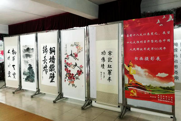 | 近日,由我校离退休党工委、离退休工作处主办,秋菊诗书画摄影协会承办的“喜看十八大以来变化,展望十九大胜利召开暨纪念中国人民解放军建军90周年”书画摄..