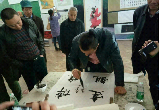 | 图为书法家正在聚精会神创作日前,遵化美术研究会与唐山市石城书画院在唐山开平区凤凰花卉东大厅联合举办了唐山世界园艺博览会书画展,迎接唐山世园会的到来..